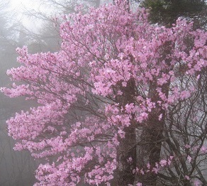 シオが群生し、霧の中で咲き誇るアカヤシオは天空に幽閉された天女のようだった。沢口山から寸又峡温泉に