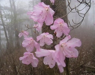 | 霧中に咲く満開のアカヤシオ | アカヤシオ | ヤマイワカガミ |