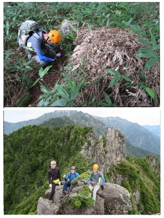 稜線の途中では、雨巣(あます *クマの巣)を発見!(写真)クマが雨水を避けて作ったものらしいです。ク