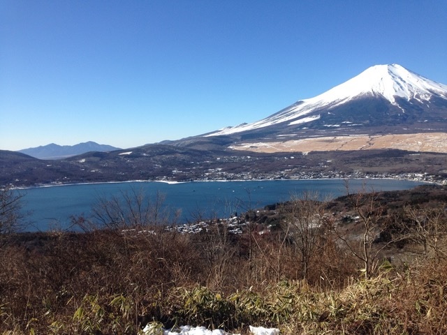 二ツ塚、奥には愛鷹山が見えます。眼下には山中湖が横たわり、凍った湖面には小舟がいくつか浮いていま