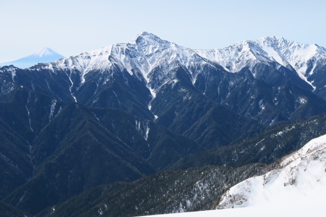 の強風の中でよろけながらやっと蝙蝠尾根を登り返し、仙塩尾根に下りると晴れて塩見も富士山もばっちり見晴ら