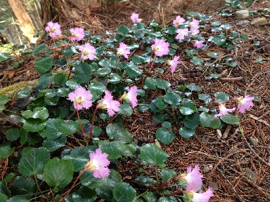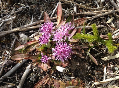 登り初めて早々に尾根道にイワウチワの群落が延々と続き、横岳を過ぎた稜線にはショウジョウバカマの群落