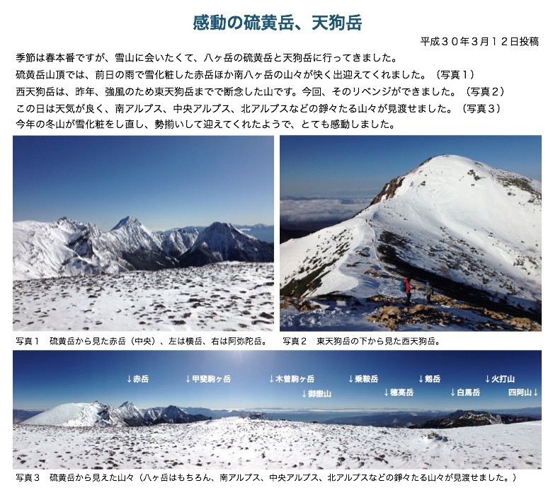この写真は山頂から見えた越後三山(左から中ノ岳、八海山、越後駒ヶ岳)の景観です。
