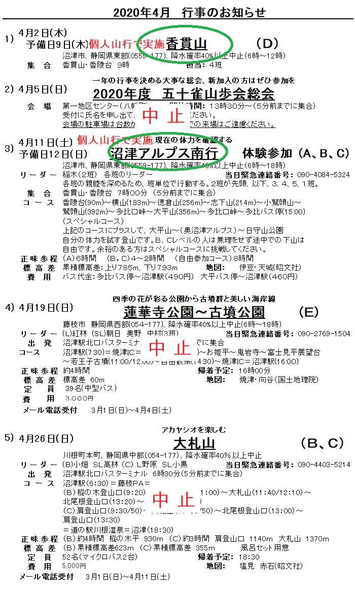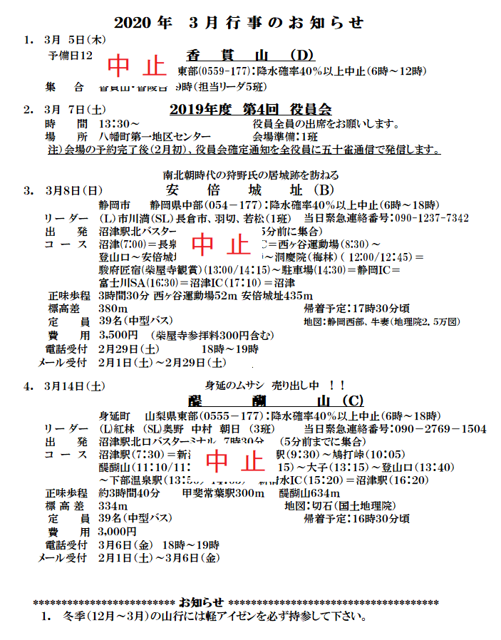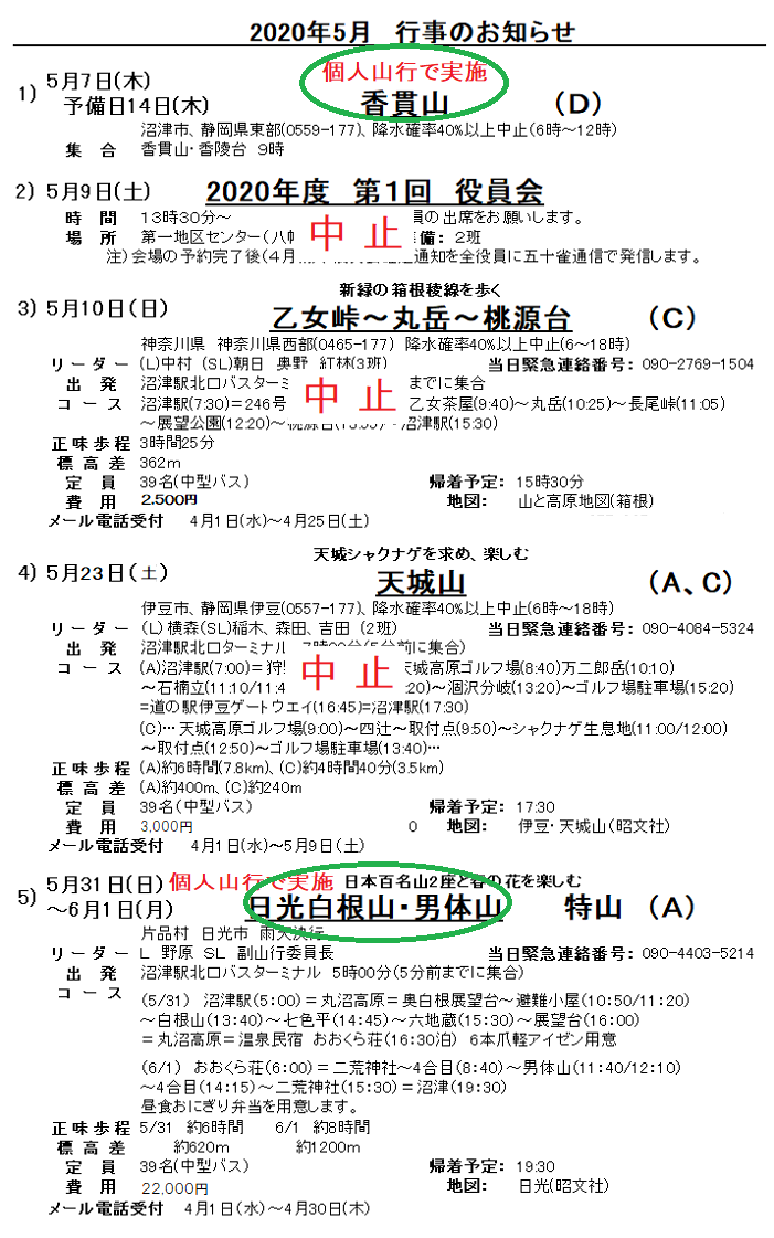 尚、マイクロバス山行やJR山行は現状通りで変更はありません。但し、マイクロバスも参加者が